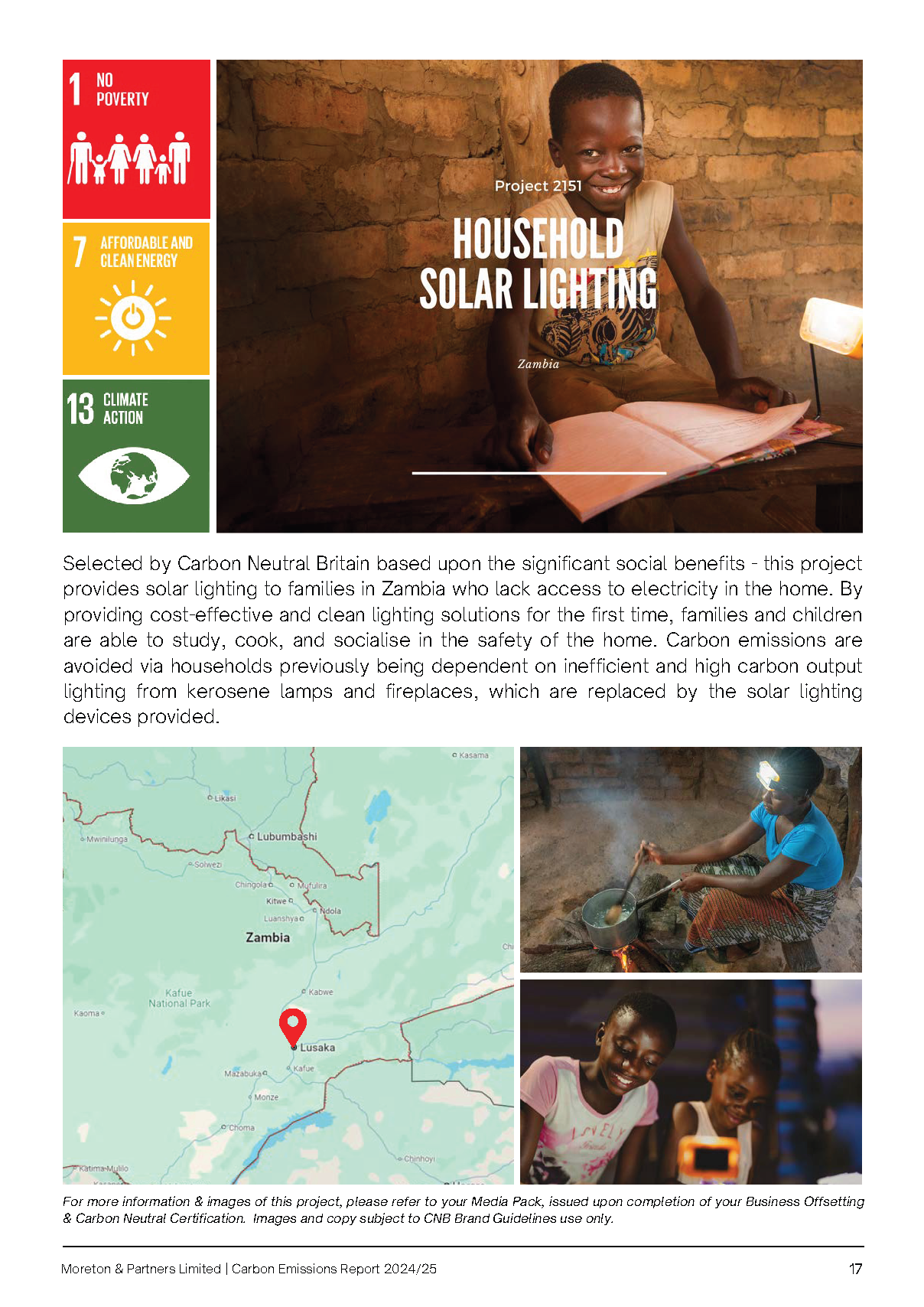 Through the Carbon Neutral Britain Climate Fund™, Moreton & Partners Limited has offset its total carbon emissions through internationally certified carbon offsetting projects. Certified via the Verra - Verified Carbon Standard (VCS), the Gold Standard - Voluntary Emission Reductions (VER) or the United Nations - Certified Emission Reductions (CER) programmes, the projects have also been selected based on their direct and indirect impact around the world - not just in offsetting, but also in supporting education, employment and clean water, as well as having net positive impact on the local wildlife and ecology.